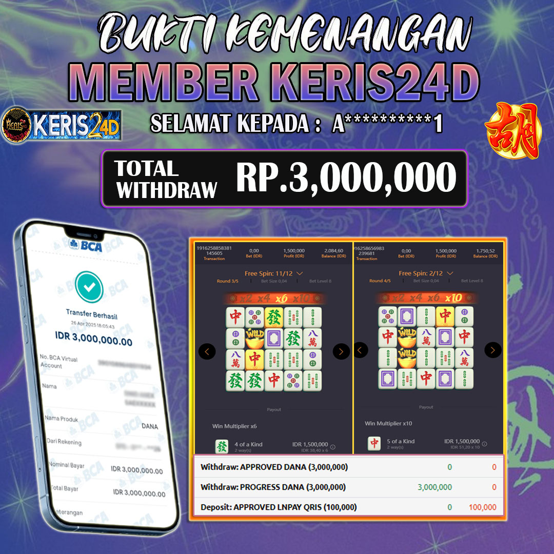 Setiap hari, member KERIS24D berhasil meraih jackpot besar dari berbagai provider slot ternama yang kami sediakan, seperti Pragmatic Play, Habanero, PG Soft, dan masih banyak lagi. Kami secara rutin menampilkan bukti screenshot atau rekapan kemenangan yang berhasil diraih, mulai dari kemenangan ratusan ribu hingga puluhan juta rupiah. Semua slip kemenangan ini kami hadirkan untuk membuktikan bahwa di KERIS24D, peluang menang itu nyata.