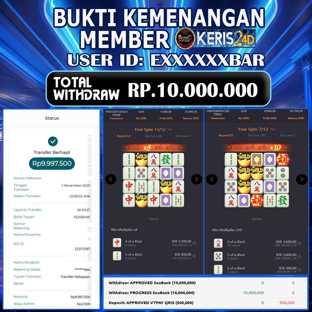 Setiap hari, member KERIS24D berhasil meraih jackpot besar dari berbagai provider slot ternama yang kami sediakan, seperti Pragmatic Play, Habanero, PG Soft, dan masih banyak lagi. Kami secara rutin menampilkan bukti screenshot atau rekapan kemenangan yang berhasil diraih, mulai dari kemenangan ratusan ribu hingga puluhan juta rupiah. Semua slip kemenangan ini kami hadirkan untuk membuktikan bahwa di KERIS24D, peluang menang itu nyata.